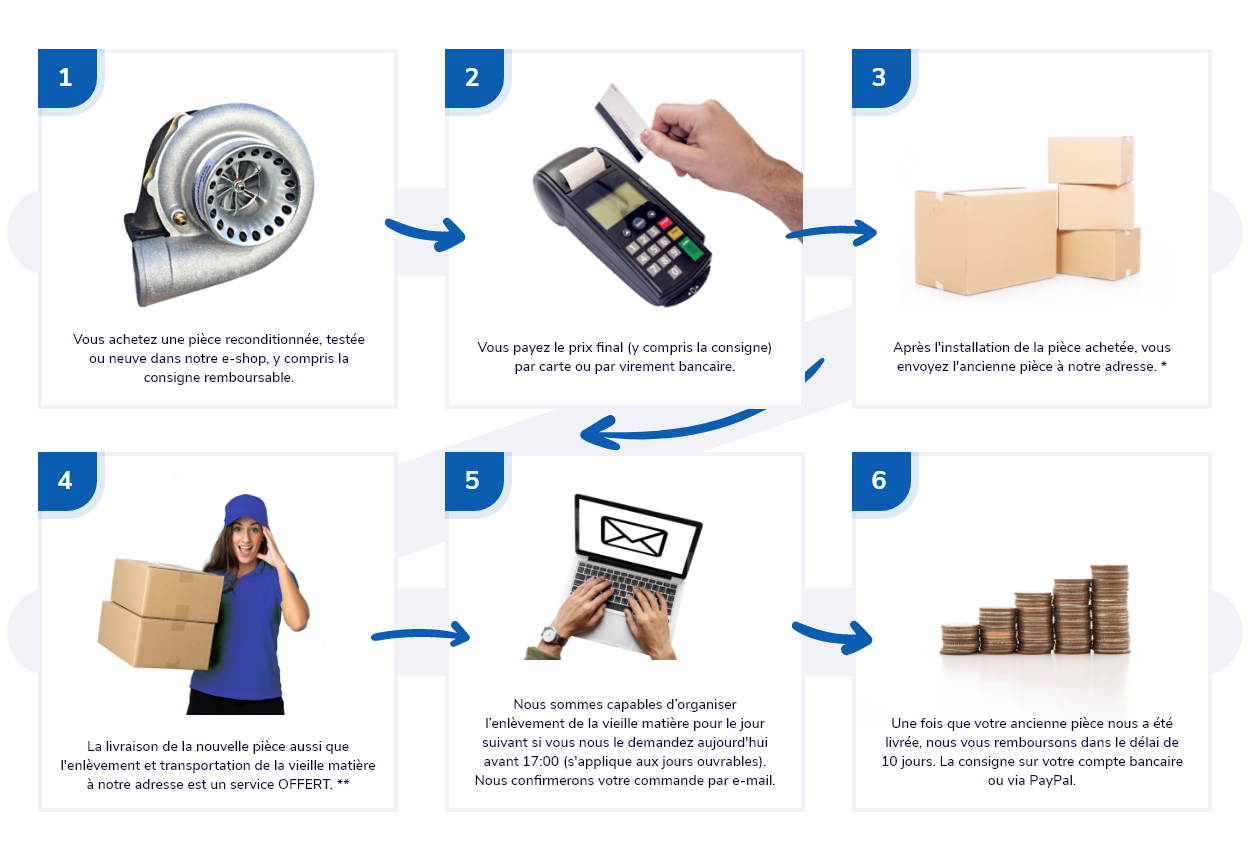 - Effectuez l'achat d'une pièce reconditionnée ou neuve sur notre boutique en ligne, incluant une consigne remboursable.